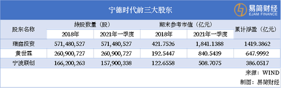 截至今年一季度,宁德时代第一大股东为瑞庭投资,占总股本比例24.5%,实控人为宁德时代董事长曾毓群和副董事长李平。