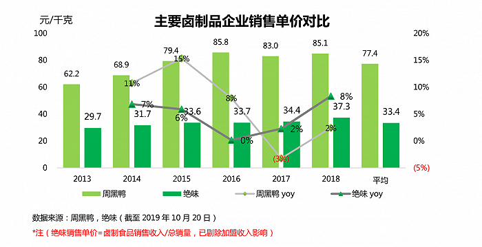 根据虎嗅网的数据,周黑鸭2018年的客单价高达63.66元,同比之下,绝味在30块钱以下。不仅如此,周黑鸭的产品定价也远高于其他品牌,日常价32元/250克的价格是绝味和煌上煌39.8元/500克的1.6倍。