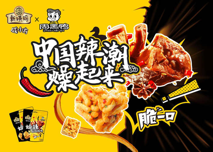 在营销上,周黑鸭除了铺出传统的线上线下广告之外,还尝试与知名品牌合作,扩大周黑鸭风味首尝人群,实现联合推广,拉升品牌价值和新品认知度。