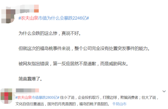 不少网友也纷纷表示,农夫山泉“福岛白桃”事件的宣传与事实不符,且农夫山泉公关能力“蠢爆了”。还有网友质疑,农夫山泉在产品广告宣传中用“日本桃子”是认为“舶来的桃子理所应当更贵,水的韭菜不好割,要换一个更隐蔽一些的方式。”另一方面,资本市场方面也没有对农夫山泉的声明买账,随着事件的逐渐发酵,农夫山泉的股价在6月28日开盘即跌,盘中跌幅一度超过6%,虽然收盘跌幅收窄,但农夫山泉的股价下跌导致市值蒸发也在当日冲上了热搜。