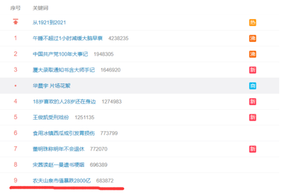 如今,随着“福岛白桃”事件的发酵,农夫山泉也被推上了风口浪尖。6月28日,#农夫山泉市值暴跌2800亿#被推上热搜。而截至6月29日收盘,农夫山泉最新市值为4419.86亿港元,相较今年1月初的股价高点,市值蒸发超3200亿港元,几近“腰斩”。