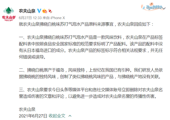 对此,6月27日上午,农夫山泉紧急回应称,农夫山泉拂晓白桃味苏打气泡水是一款风味饮料,产品标签配料表是按照食品安全国家标准的规范要求,而该产品的配料中没有从日本福岛进口的成分,且产品标签标示并无任何错误或误导。同时声明,拂晓白桃原产于福岛,农夫山泉研发人员只是创制了类似拂晓桃风味的产品。6月29日,记者发现,农夫山泉已经删除了关于拂晓白桃味苏打气泡水的相关文章。