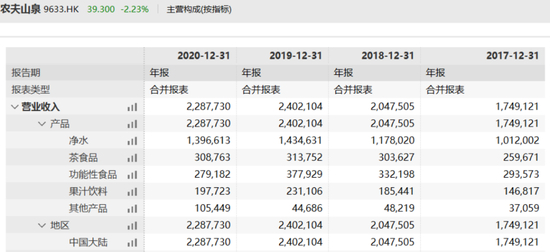 值得注意的是, Wind数据显示,农夫山泉的传统饮品如包装水、茶饮品、功能性饮料、果汁饮料等的营收都出现了不同程度的下滑,而包括农夫山泉苏打水、咖啡、植物酸奶等新产品的“其他产品”却在2020年营收达10.54亿元,同比增长135.98%,但该部分在农夫山泉2020年的总营收占比较低,仅为4.61%。