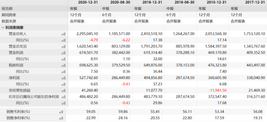 与股价下跌相对应的是农夫山泉总营收的下降。Wind数据显示,农夫山泉在2020年的业绩公告中,实现净利润52.77亿元,同比增长6.6%;营业总收入229.5亿元,同比下降4.79%,跌幅较2020年中期跌幅的6.2%有所收窄。值得注意的是,农夫山泉的毛利率一直备受市场关注,最新数据显示,2020年农夫山泉毛利率达到了59%。