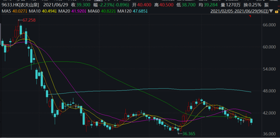 Wind数据显示,6月28日,农夫山泉(9633.HK)开盘即跌,当日曾跌超6%,盘中最低价为38.5港元/股,此后股价跌幅有所收窄,收盘报价40.4港元,跌1.58%。截至6月29日,跌势持续,开盘报40.4港元/股,收盘报39.3港元/股,跌2.23%,最新市值为4419.86亿港元。相较于今年初的股价巅峰期,目前市值蒸发超3200亿港元。