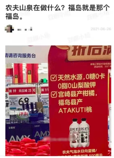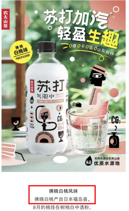 近日,有网友发现农夫山泉旗下一款气泡水饮品——拂晓白桃味苏打气泡水,在商场宣传以及产品宣传语中出现了“福岛县产” “拂晓白桃产自日本福岛县”等字眼。一时间,关于农夫山泉气泡水的原料产地问题,争议四起。