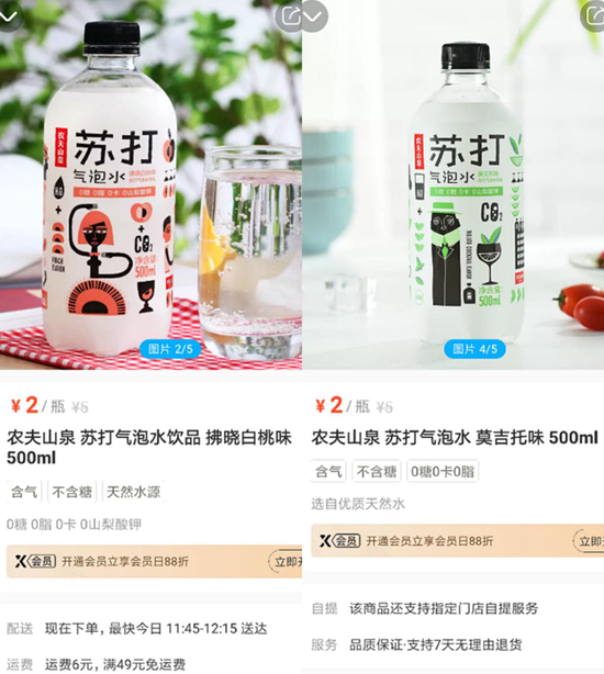 同时,《商学院》记者6月29日在盒马APP上发现,农夫山泉单瓶售卖的拂晓白桃味和莫吉托味的苏打气泡水已经降价并以4折出售,原价5元/瓶,现价2元/瓶,且库存充足可多瓶购买。但记者也发现,在该平台及天猫、淘宝、京东、拼多多等其他电商平台上,以4、9、15瓶打包出售的农夫山泉拂晓白桃味苏打气泡水仍是原价出售。对于降价原因,《商学院》记者致电盒马APP客服,对方表示各个门店会根据当地门店的实际情况进行相应的价格调整,但具体原因不清楚。也有网友表示,“家门口超市早都打折促销了。”
