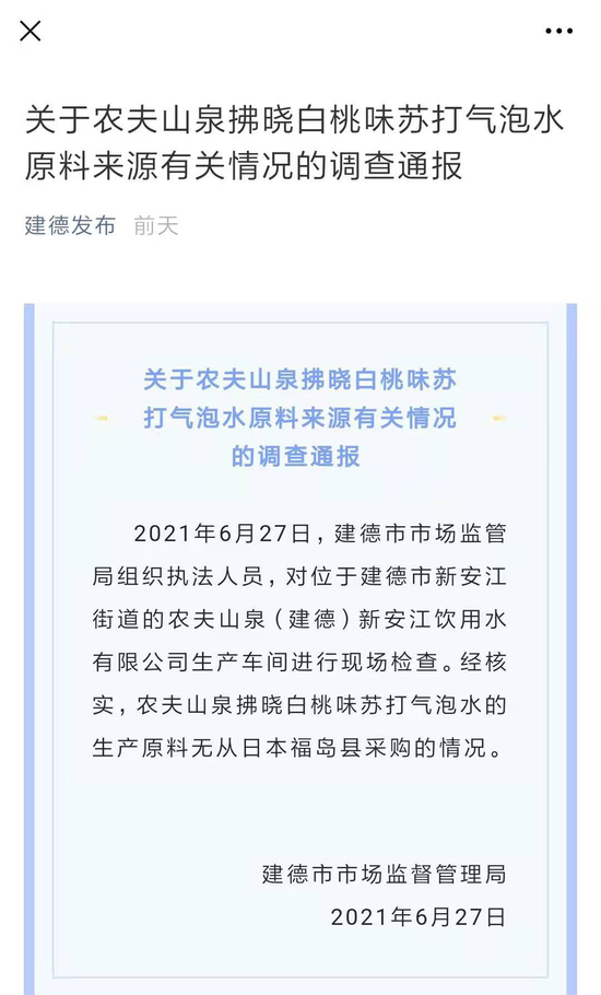 紧接着,6月27日晚间,浙江省建德市市场监督管理局也发布《关于农夫山泉拂晓白桃味苏打气泡水原料有关情况的调查通报》称,经核实,该产品的生产原料无从日本福岛县采购的情况。