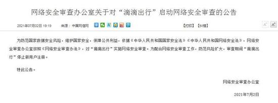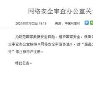 为配合网络安全审查工作,防范风险扩大,审查期间“滴滴出行”停止新用户注册。