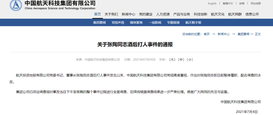 7月4日,中国航天科技集团有限公司通报称,张陶同志即日起暂停履职、配合调查,后续将根据调查结果进一步严肃处理。