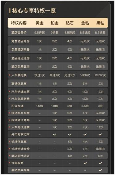 相关的报道说,在会员权益方面,金钻贵宾所享权益与黑钻贵宾极为接近。权益涵盖:酒店会员价8.5折起,接送机车型升级、机场休息室、机场快速安检、酒店无忧退订等近20项,几乎实现对旅行场景的全覆盖。