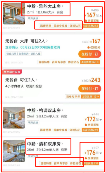 根据该用户晒出的截图,其预定了中黔雅韵大床房,首单专享体验钻石价格为167元。