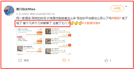 5月21日,其在微博上投诉携程说,同一家酒店,同样的时间价格相差几十元。