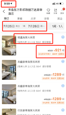 另一张预定页面截图则显示,当其使用“金钻会员”进行预定该房型时,显示的折后价却是921元。