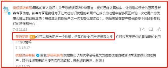 携程的回复并不能说服该用户。@筱莜昃雨进一步质疑说:你可以和老用户一个价格,但是你比老用户还低那么多,你想过常年在你这里消费的老用户的心情吗?
