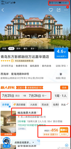 7月3日,微博用户@筱莜昃雨通过个人微博晒出的截图显示,其预定了7月25日的青岛东方影都融创万达嘉华酒店。