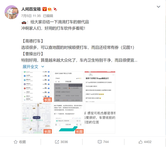 7月5日,微博博主@人间百宝箱做了一条攻略,为大家总结整理了滴滴打车的代替品。上述的留言和讨论,均来自这条微博。