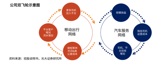 一个飞轮代表的是出行网络:平台司机增加 → 乘客等待时间、单位成本下降 → 吸引更多乘客带来流量 →更多司机加入平台。另一个飞轮则为汽车服务网络:降低司机运营成本 → 司机和平台创收增加 → 更多司机加入 → 规模效益增加。