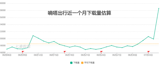 七麦数据显示,T3出行近一个月下载量估算图中,7月4日之前,数据是一条相对平稳的曲线,下载量每日保持在15000左右,7月4日当天,下载量出现了接近90度的增长,飙升到了50000左右。