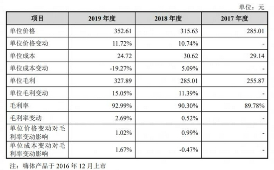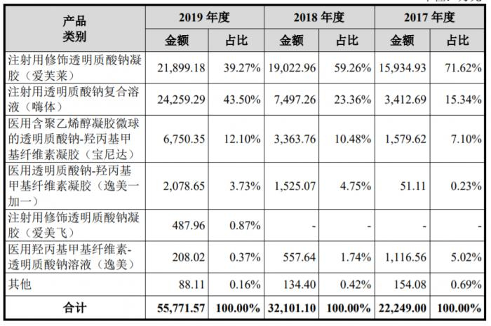 嗨体通用名为“注射用透明质酸钠复合溶液”,2016年12月取得Ⅲ类医疗器械注册证,是目前唯一经国家药监局批准的针对颈部皱纹改善的III类医疗器械产品,填补了颈部皱纹修复领域的空白。2017年至2019年,嗨体收入分别为3400万元、7500元、2.4亿元,2019年收入同比增长224%。
