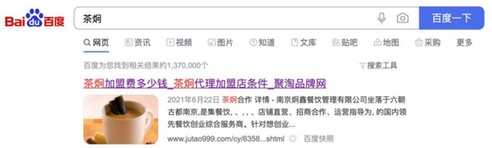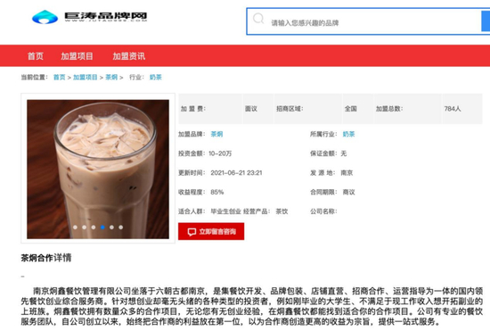 就上述茶炯品牌来说,即便已有多位加盟商发现公司出现问题,甚至到了注销边缘。但蓝鲸财经记者在百度搜索茶炯时,首位显示的仍然是其加盟广告,点击进入后发现,该加盟广告展示于巨涛品牌网,更新时间为2021年6月21日,而详情介绍为“自公司创立以来,始终把合作商的利益放在第一位,以合作商创造更高的收益为宗旨,提供一站式服务。”若非加盟商的爆料,蓝鲸财经记者仍会以为该品牌在持续招商。