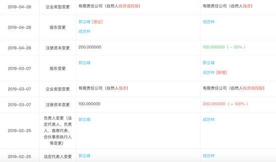 蓝鲸财经记者通过天眼查平台看到,南京炯鑫餐饮管理有限公司的确在成立一年后的2月25日,进行了法定代表人及负责人变更,由最初的郭立峰变更为成世林,后续,又通过引入股东的方式,将公司类型由(自然人独资)有限责任公司变更为(自然人投资或控股)有限责任公司,再之后,郭立峰顺势退出公司股东,与炯鑫公司再无关联。