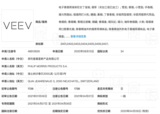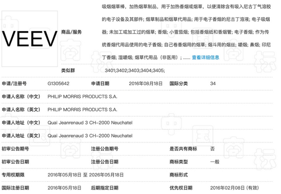 菲莫说VEEV是自己独创设计的标识和品牌,本身为臆造词汇,没有固定含义,使用在电子雾化器和配套电子烟油上具有显著性,并且在2016年5月2021年4月获得了第34类烟草注册商标专用权。