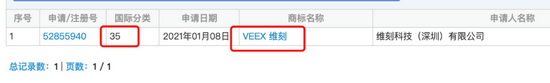 搜索VEEX 维刻,一条结果,申请人维刻公司,申请类别35类,也就是广告宣传类,无34类烟草商标。