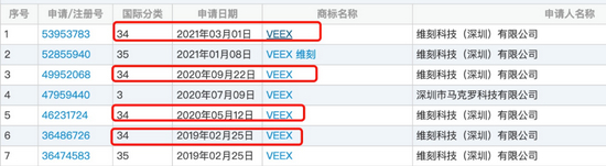 蓝洞查询了VEEX在第34类的商标注册情况后发现,维刻提交的申请大部分处于无效状态。