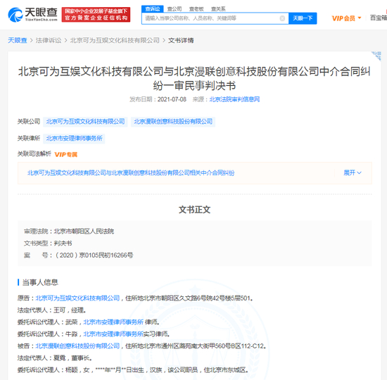 天眼查App显示,7月8日,北京可为互娱文化科技有限公司与北京漫联创意科技股份有限公司中介合同纠纷一审民事判决书公开,案号(2020)京0105民初16266号,审理法院为北京市朝阳区人民法院。原告为北京可为互娱文化科技有限公司,被告为北京漫联创意科技股份有限公司。