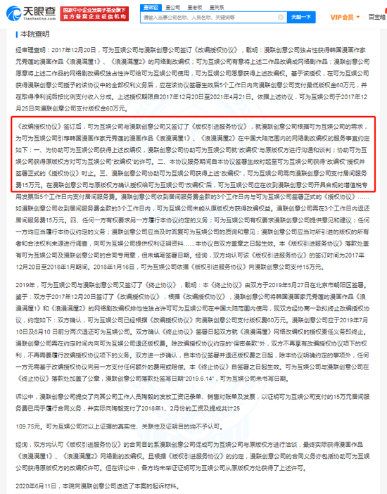 判决书显示,原告可为互娱曾先后与被告漫联创意公司签订协议等,约定被告独家授权给原告《浪漫满屋1》、《浪漫满屋2》的网络剧改编权,并协助原告获得原版权方的改编权许可。但协议签订后,被告并未协助原告从原版权方处获得相关确认或许可文书,双方签订终止协议后,被告至今未返还服务费全款。原告诉求被告漫联创意公司返还居间服务费15万元。
