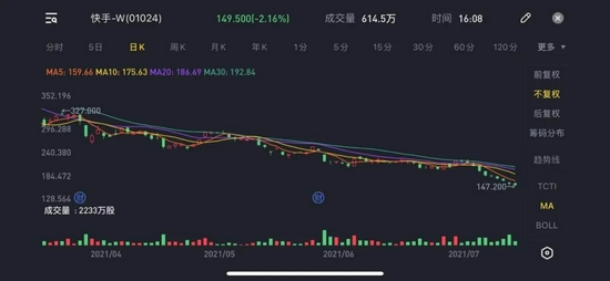 从6月28日开始,快手的股价连续跌了10个交易日,截至7月12日收盘,快手的股价为149.5港元,总市值为6218亿港元。