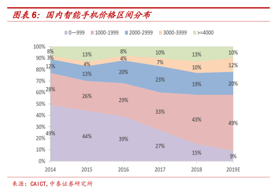 虽然近几年,电子产品消费分级已成趋势,但百元低端机的处境却越来越差。根据中泰证券的数据,2014~2019年,智能手机平均单价总体上逐年攀升,而999元以下机型的份额,从49%缩水至9%[19]。