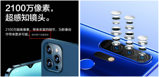 稍微良心点的ivvi,会在手机镜头的产品介绍页里用小字号标注“其中两个(摄像头)为装饰件”,而过分如小辣椒,还特地在海报上给每一个摄像头做了爆炸视图,“伪装”成复杂的镜头结构。