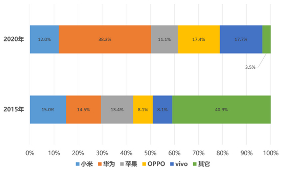 2015年与2020年中国智能手机市场份额对比 | 放大灯团队制图