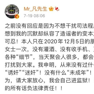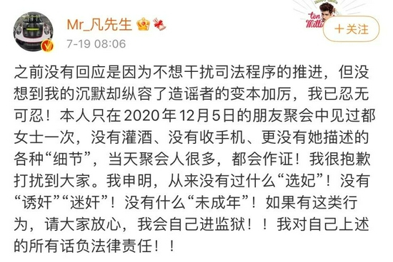 7月19日,吴亦凡通过社交平台发声回应,称他只见过都女士一次,没有灌酒、没有收手机、更没有她描述的各种“细节”。吴亦凡还强调,从来没有过“选妃”“诱奸”“迷奸”和“未成年”。