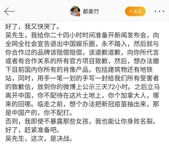 晚间,都美竹二度发文,直指吴亦凡存在迷奸、诱奸、与未成年人发生性关系的行为,称将进行“决战”,她要求吴亦凡站出来,24小时内开发布会退出娱乐圈。也正是在这条博文中,都美竹讲到了更多私密的内容,成为了网友们进一步嘲讽吴亦凡的素材。