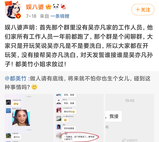 9点,24小时时限已到。网友先等来了吴亦凡工作室的“关于近期舆论的十点澄清”。但关于聊天截图的真实性很快被质疑,都美竹的姐姐也发文,并贴出吴亦凡鹿晗等人同行的相关截图,指出其中一人为都美竹。很快,2018《中国新说唱》选手于嘉萌表示自己就在现场,该女子并非都美竹。