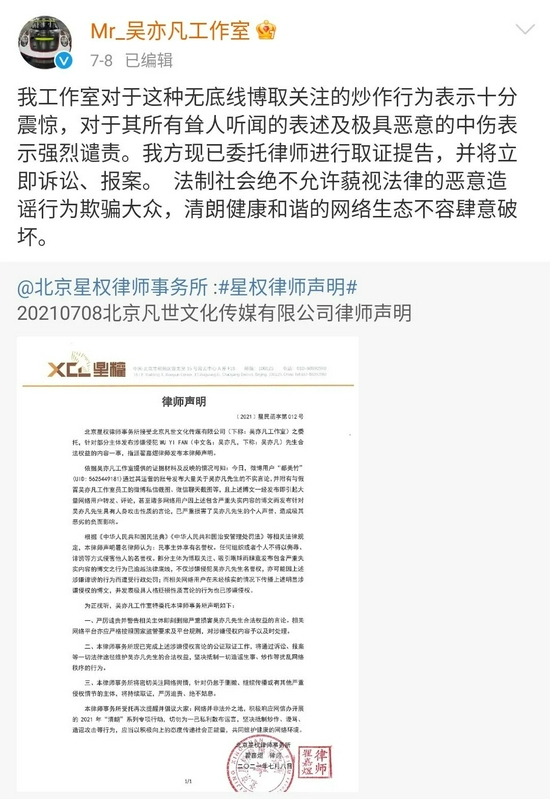 博文提及内容涉及顶流明星、性剥削、娱乐圈黑暗交易,引发了网友广泛关注,迅速登上微博热搜。7月8日晚,吴亦凡工作室发文表示这是无底线的炒作行为,已委托律师取证提告,并将立即诉讼。