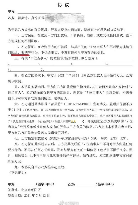 7月17日,都美竹晒出疑似来自吴亦凡方的和解协议以及转账记录录屏,两个转账账户分别为WU YI FAN和WU STACEY YU。都美竹称,她的一位律师朋友否定了这份协议的效力,认为这反而是一份“认罪书”。