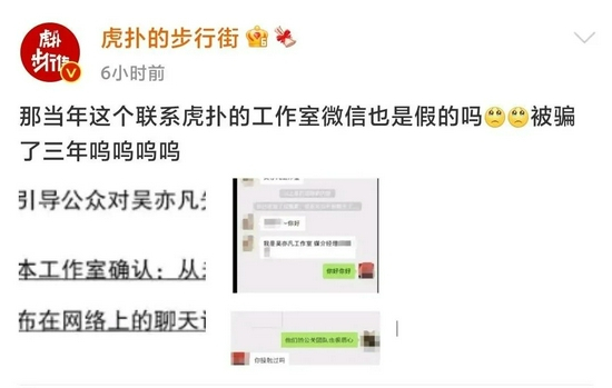 另一方面,虎扑自己也成为此次事件的“瓜主”与“舆论影响者”:吴亦凡工作室官方微博声称“未曾注册吴亦凡工作室微信号”,虎扑则放出三年前与“吴亦凡工作室”的微信聊天界面,“打脸”其声明;用多种语言转发“24小时”倒计时,并@吴亦凡要求做出“正面回应”。