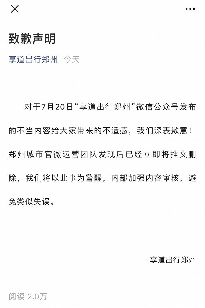 更有甚者,7月20日当天,享道出行郑州在其公众号上发布的郑州启动I级红色暴雨预警,居然用了“我有点大,你们忍一下”的标题,很明显在用同样是近期热点的吴亦凡丑闻事件玩梗。