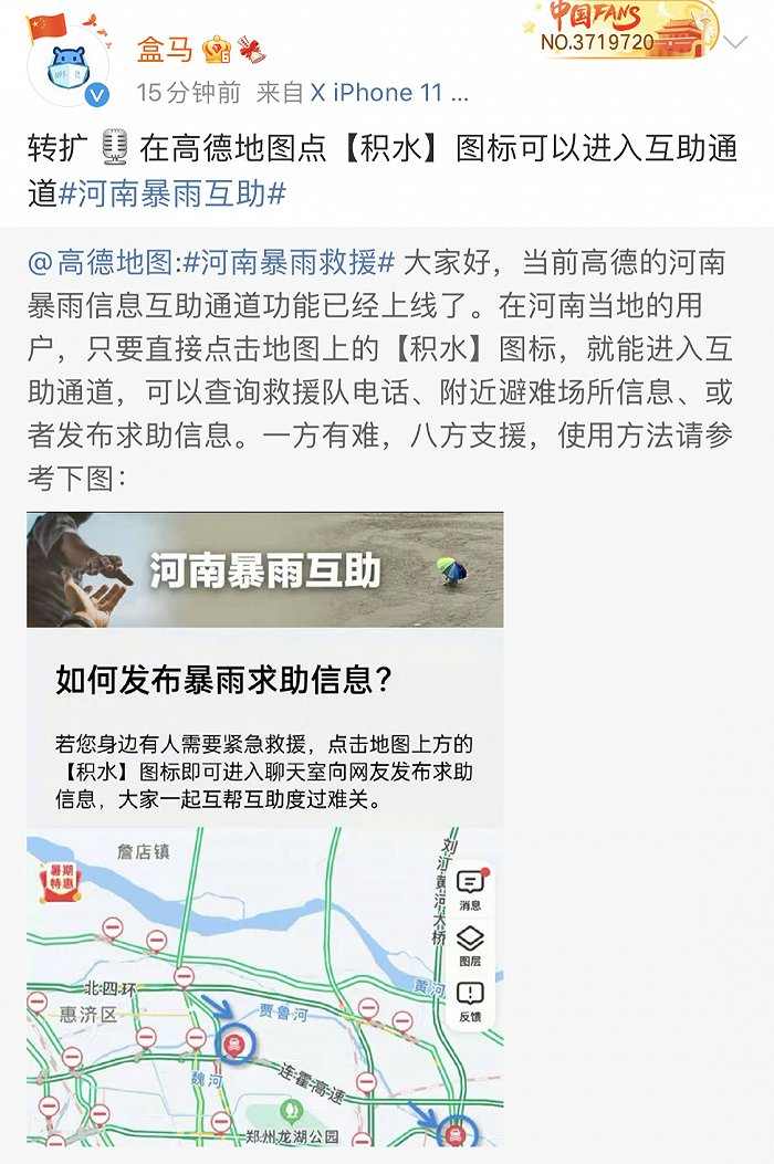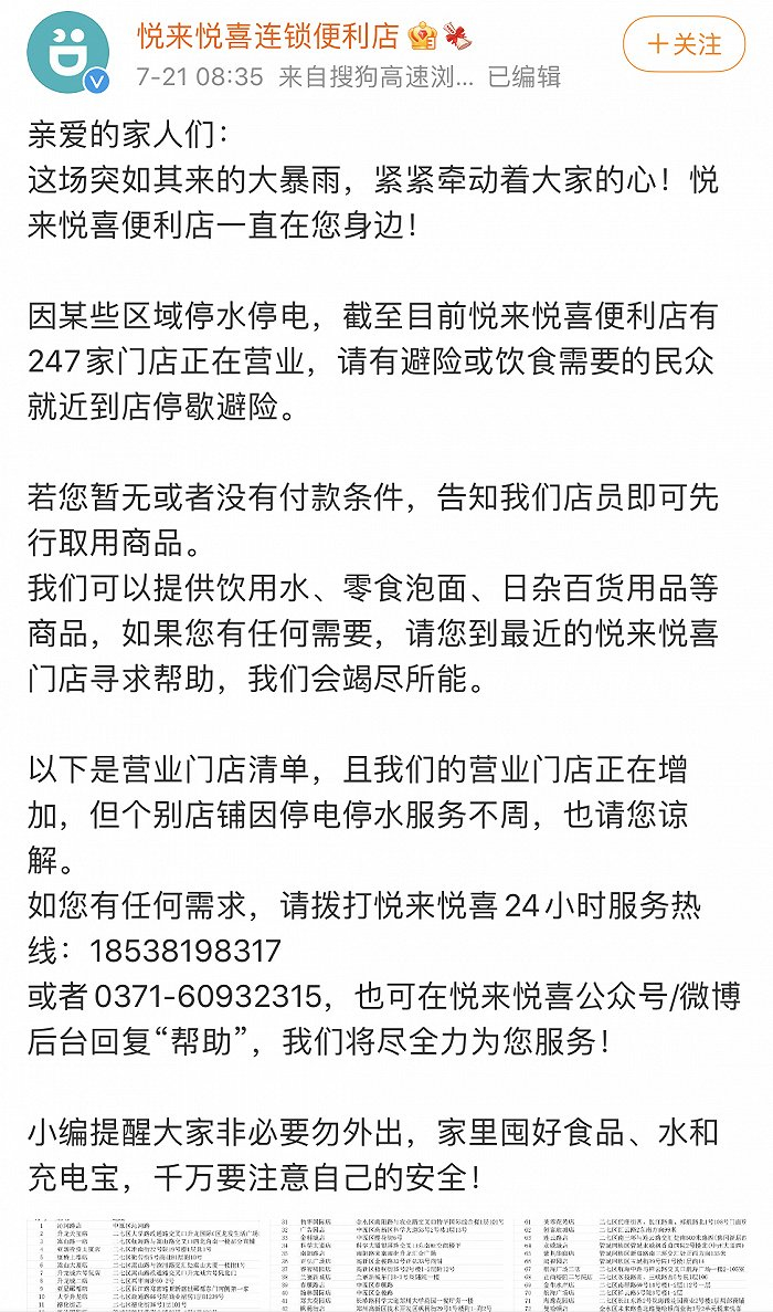 二是利用自身的技术手段、门店资源等帮助救灾。比如高德地图发布“河南暴雨积水地图”,河南当地的用户直接点击地图上的“积水点”图标,就能进入相关聊天室,发布求救信息,并获得救援队电话、避难场所位置等即时资讯;中国石油在社交平台发布了中石油郑州抗洪抢险保供加油站信息;河南当地的便利店悦来悦喜也在微博发布了为民众提供帮助的247家门店位置信息。
