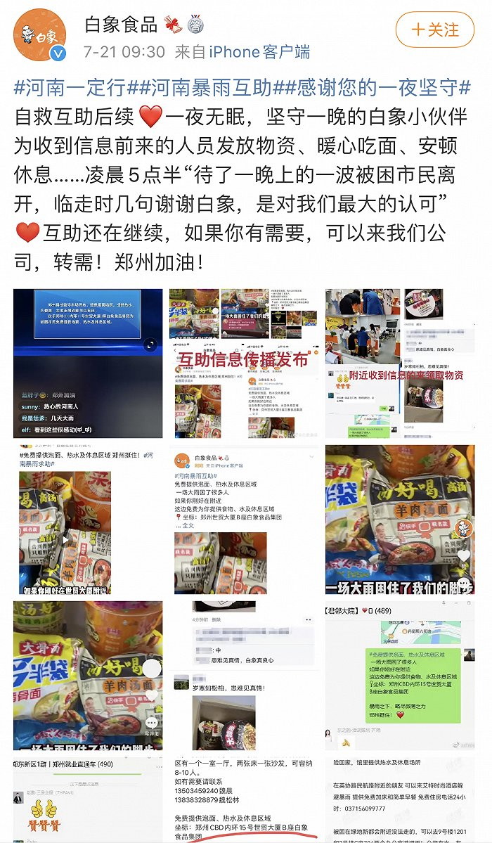 在本次的河南暴雨洪涝灾害面前,比较妥当的做法有几种,一是运用在社交平台上的公共影响力转发求助、防灾信息等进行支持,比如郑州当地企业白象食品在微博上坚持互助信息传播发布,为市民提供安置休息场所和食品等。