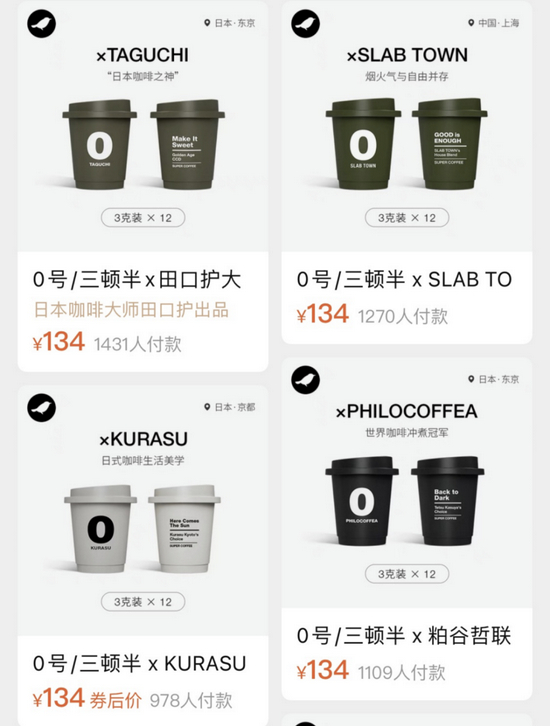 除混搭外,三顿半另一条研发新品的策略是走联名路线。目前天猫旗舰店在售的产品中,三顿半分别与KEEP、RAC、理想国等12个品牌联名开发出各自单品,均为数字系列的超即溶咖啡粉。