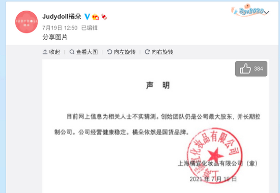 随后,橘朵官方微博紧急发布声明称:“目前网上信息为相关人士不实猜测。创始人团队仍旧是公司最大股东,并长期控制公司。公司经营健康稳定。橘朵依然是国货品牌。”