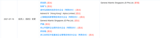 7月16日,天眼查APP显示,橘朵母公司上海橘宜化妆品有限公司(以下简称“上海橘宜”)发生工商变更,包括创始人郑自跃在内的9名股东已全部退出,上海橘宜已经由General Atlantic Singapore JD Pte.Ltd.(泛大西洋资本)100%控股。