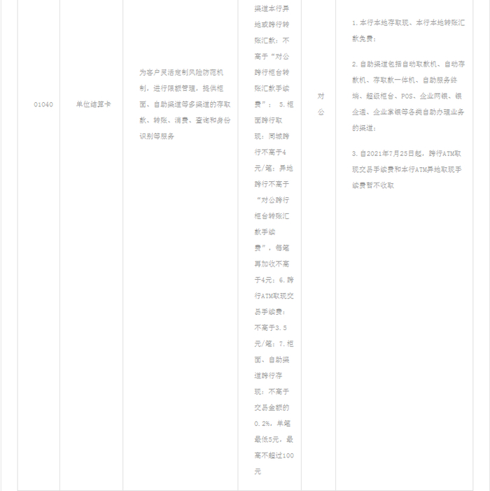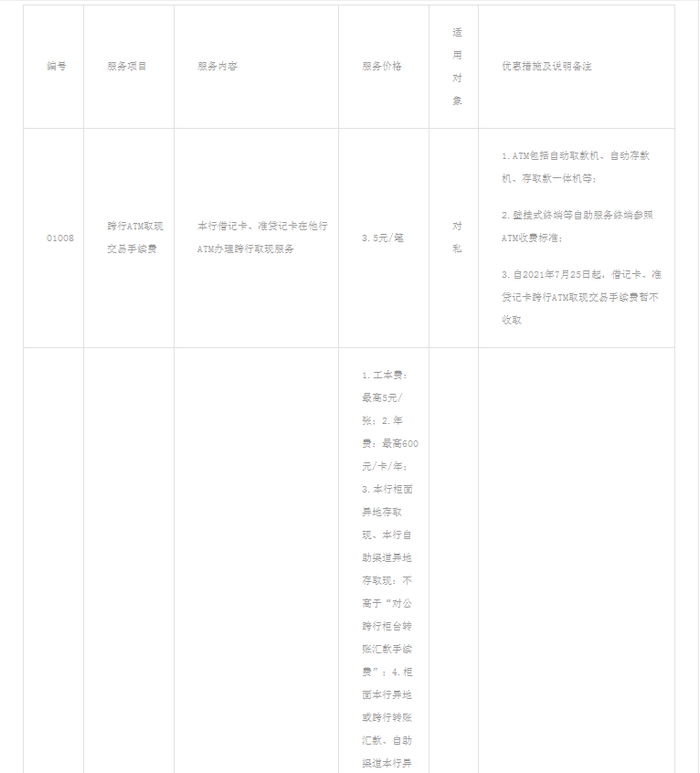 为落实中国银行业协会、中国支付清算协会《关于降低自动取款机(ATM)跨行取现手续费的倡议书》,持续减费让利,惠企利民,我行对《中国农业银行服务收费价格目录》中“跨行ATM取现交易手续费”和“单位结算卡”服务项目的服务价格、优惠措施及说明备注进行调整,并于2021年7月25日零时生效。