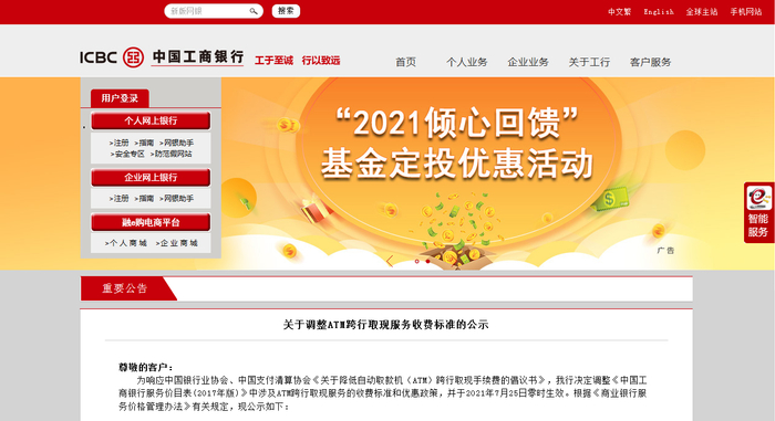 中国工商银行关于调整ATM跨行取现服务收费标准的公示