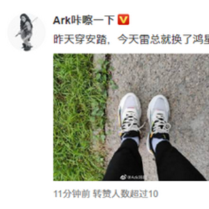 7月25日,雷军在微博上晒出了穿着安踏运动鞋的照片,目前该微博评论已经被其关闭。
